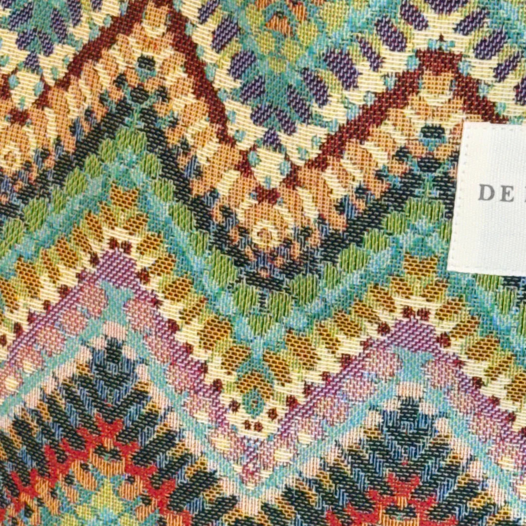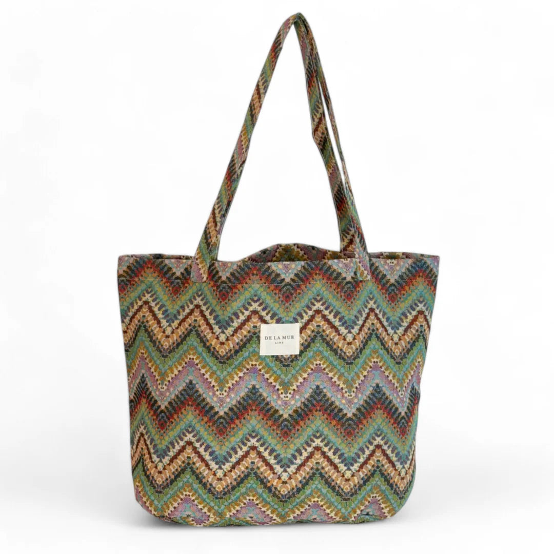 Große Shopper-Tasche mit Schulterriemen. Aus dickem Jacquard-Stoff mit mehrfarbigem geometrischem Zickzack-Druck. Für die richtige Pflege ist es ratsam, sie kalt mit der Hand zu waschen und nicht im Trockner zu trocknen.