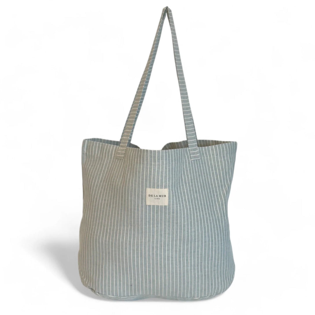Große Shopper-Tasche mit Schulterriemen. In feinem Stoff mit gestreiftem Druck in Ecru auf einem aquagrünen Hintergrund. Für eine korrekte Wartung ist es ratsam, es kalt mit der Hand zu waschen und nicht den Trockner zu verwenden.