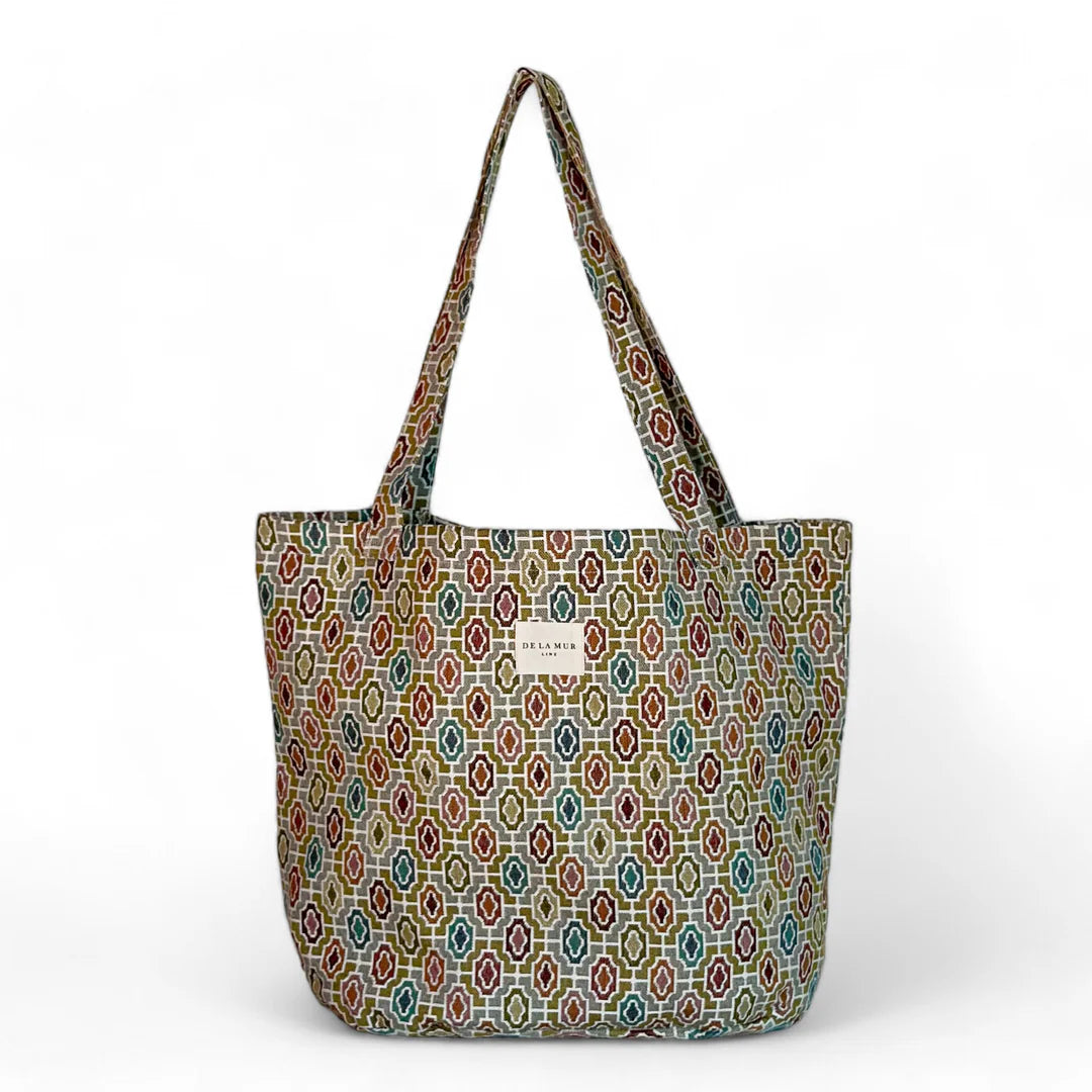 Große Shopper-Tasche mit Schulterriemen. Aus dickem Jacquard-Stoff mit geometrischem Druck in beige, rosa und blauen Tönen. Für eine korrekte Wartung ist es ratsam, es kalt mit der Hand zu waschen und nicht im Trockner zu trocknen.