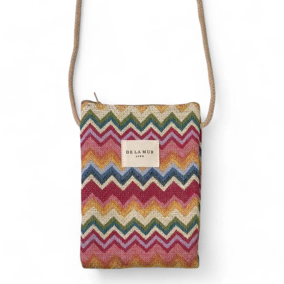 Handytasche zum Tragen als Umhängetasche. Mit Reißverschluss an der Oberseite und langer Baumwollkordel in Beige. Mit dickem Jacquard-Stoff mit Zickzack-Druck in Rosa- und Blautönen. Bei jedem Stück kann der Druck variieren, je nachdem, wo das Stück zugeschnitten wurde. Innen mit dickem grauem Stoff gefüttert. Für die richtige Pflege ist es ratsam, es kalt mit der Hand zu waschen und nicht im Trockner zu trocknen.