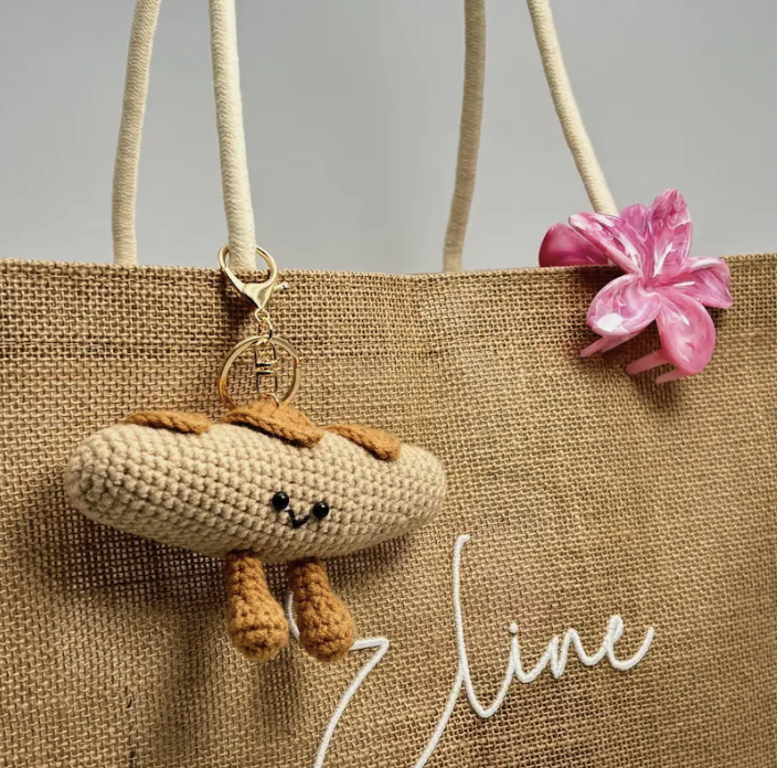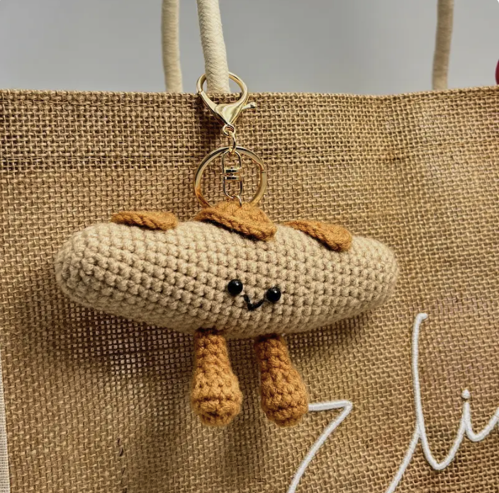 Der handgehäkelte Baguette-Anhänger vereint handwerkliche Raffinesse mit praktischer Alltagstauglichkeit.