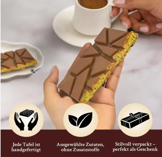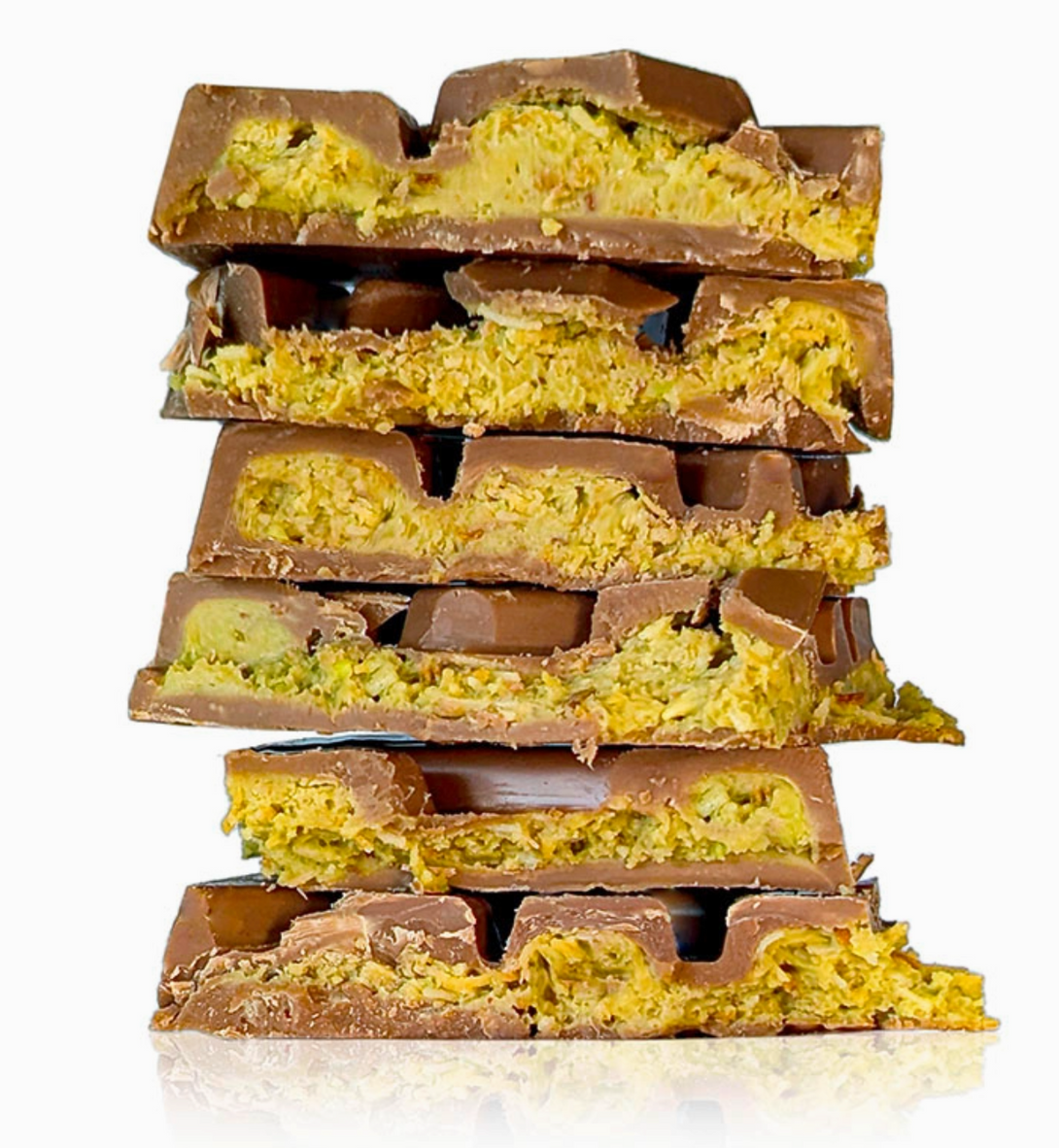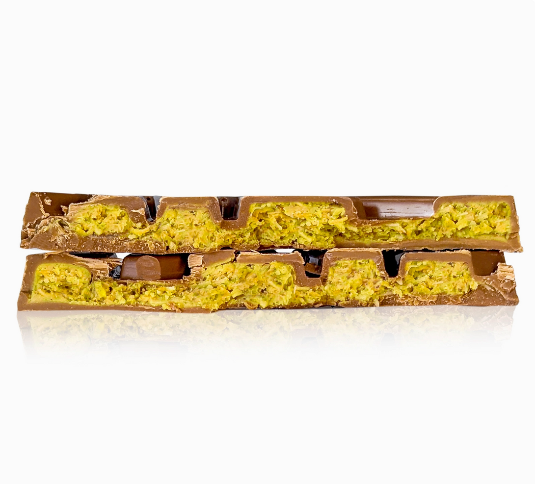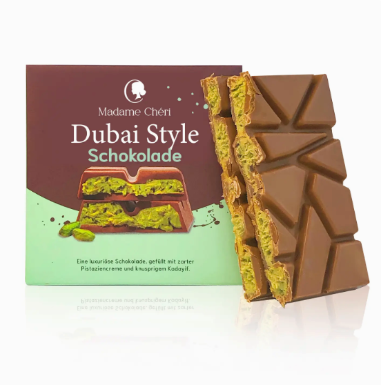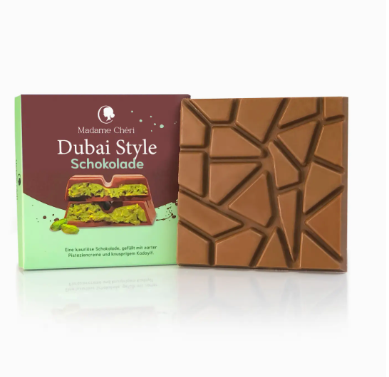 Die Dubai Style Schokolade ist eine Komposition aus zarter Vollmilchschokolade, gefüllt mit samtiger Pistaziencreme (35%) und verfeinert mit knusprigem Kadayif (5%). Ein süßer Genussmoment, der orientalisches Flair und handwerkliche Perfektion vereint.