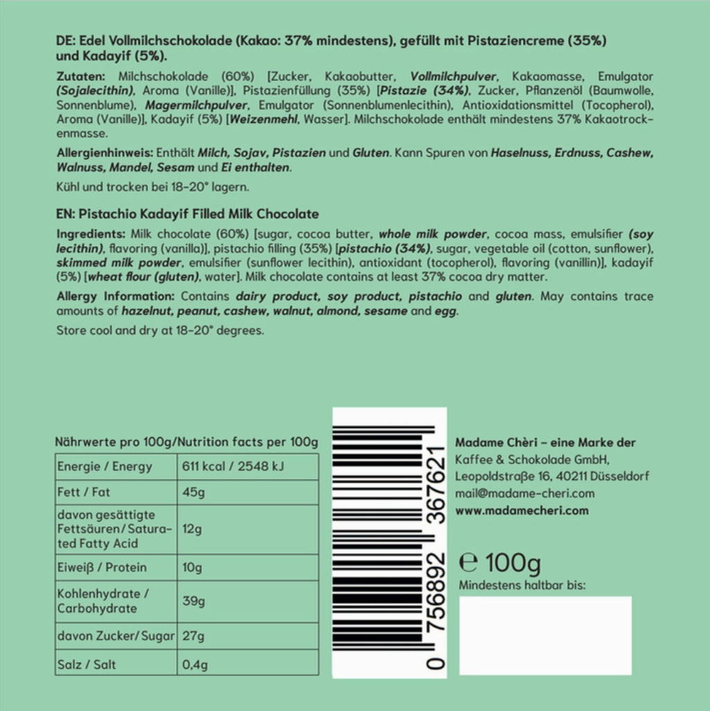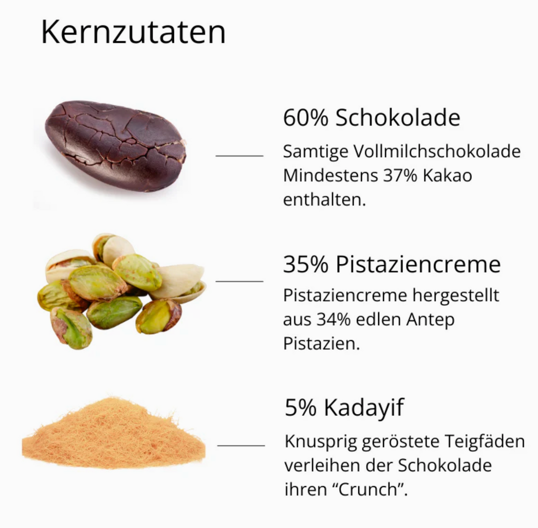 Allergene: Enthält Pistazien & Milch; kann Spuren von Soja, Gluten und weiteren Schalenfrüchten enthalten