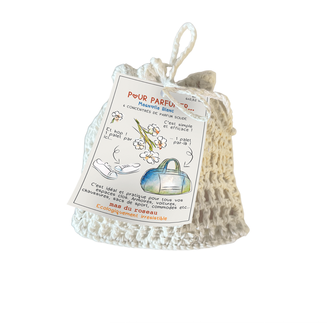 Sechs kompakte Duftpucks im OEKO-TEX®-zertifizierten Häkelbeutel parfümieren Schränke, Schubladen, Sporttaschen oder Schuhe dezent und langanhaltend. 97 % Inhaltsstoffe natürlichen Ursprungs – auf Seifenbasis, parfümiert mit 3 % Parfümkonzentrat aus Südfrankreich.
