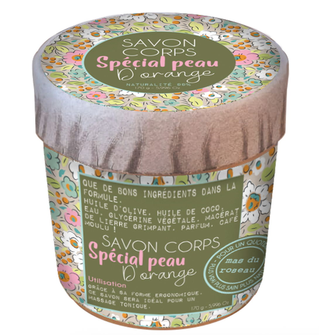 Die Körperseife mit Orangenschale kombiniert natürliche Pflanzenöle mit gemahlenem Kaffee und Efeu-Extrakt. Dank ihrer ergonomischen Form und den Peelingkörnern eignet sie sich ideal für eine belebende Massage und unterstützt gleichzeitig die Hautpflege. 99 % natürlichen Ursprungs – für ein reines und frisches Hautgefühl.