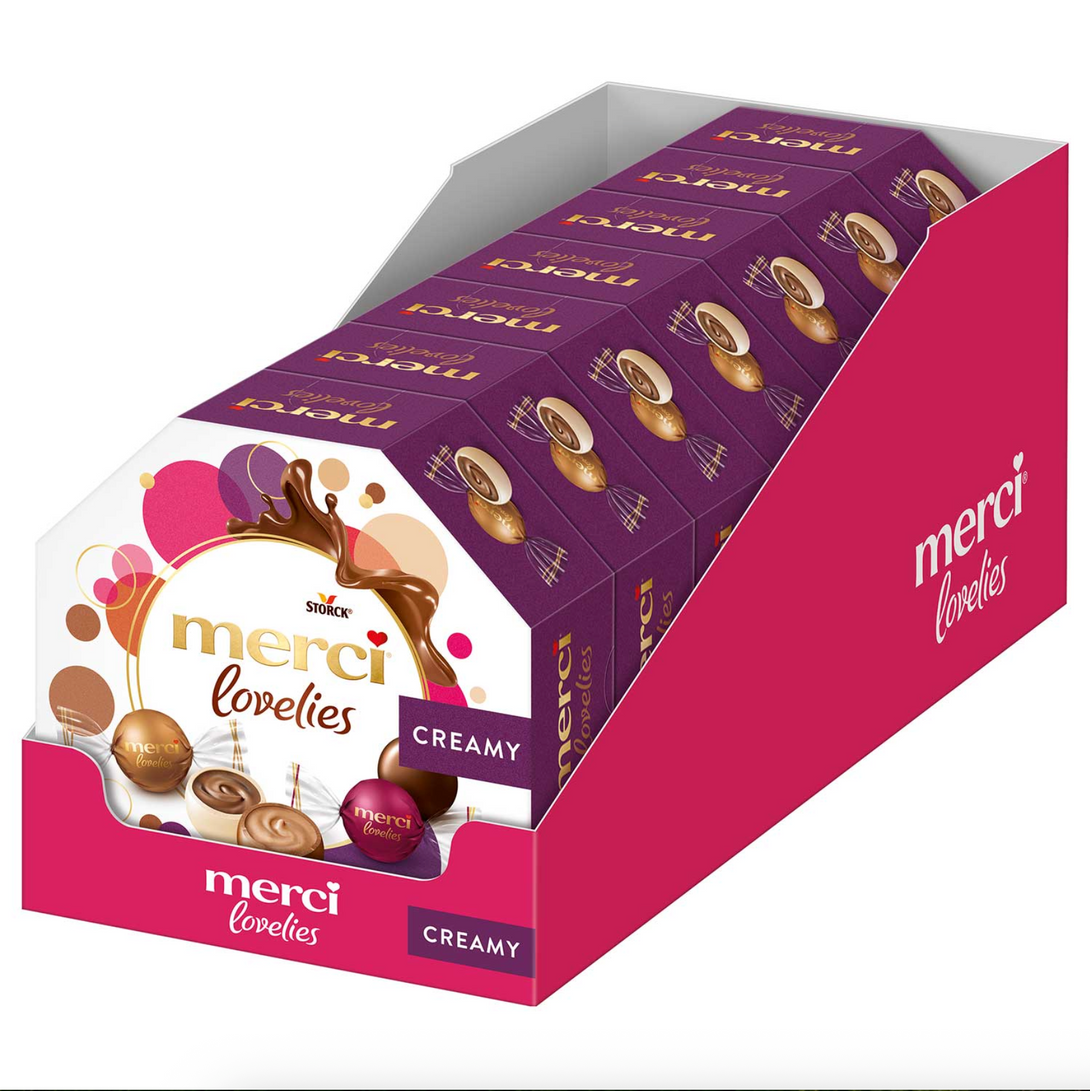 Die merci Lovelies Creamy sind kleine Schokoladenspezialitäten für große Genussmomente. In einer eleganten Geschenkverpackung finden Sie 14 fein abgestimmte Pralinen mit vier köstlichen Sorten – jede einzeln verpackt und ideal zum Teilen, Verschenken oder selbst genießen.