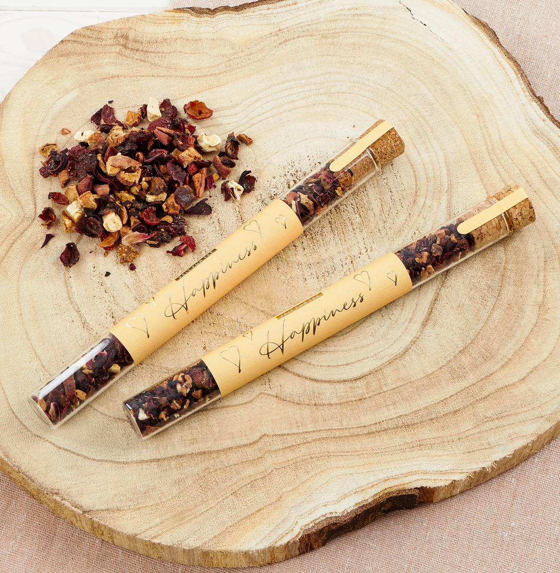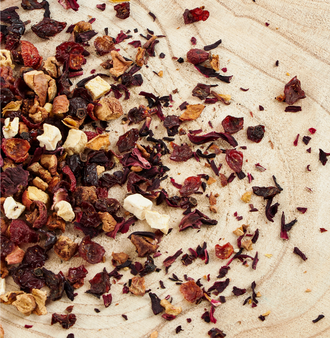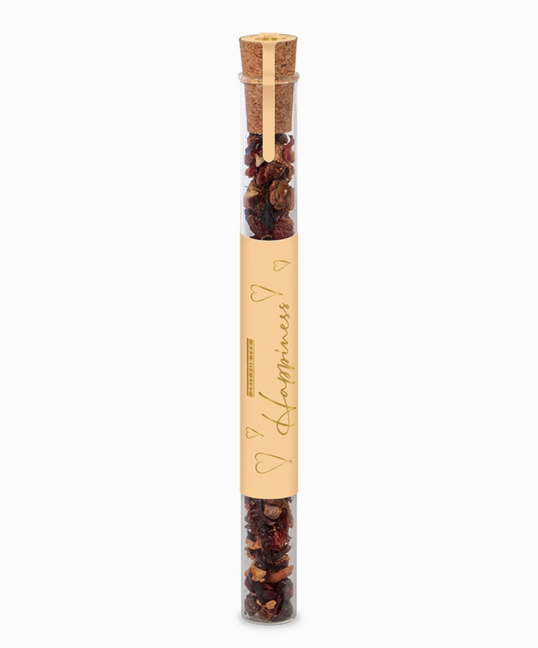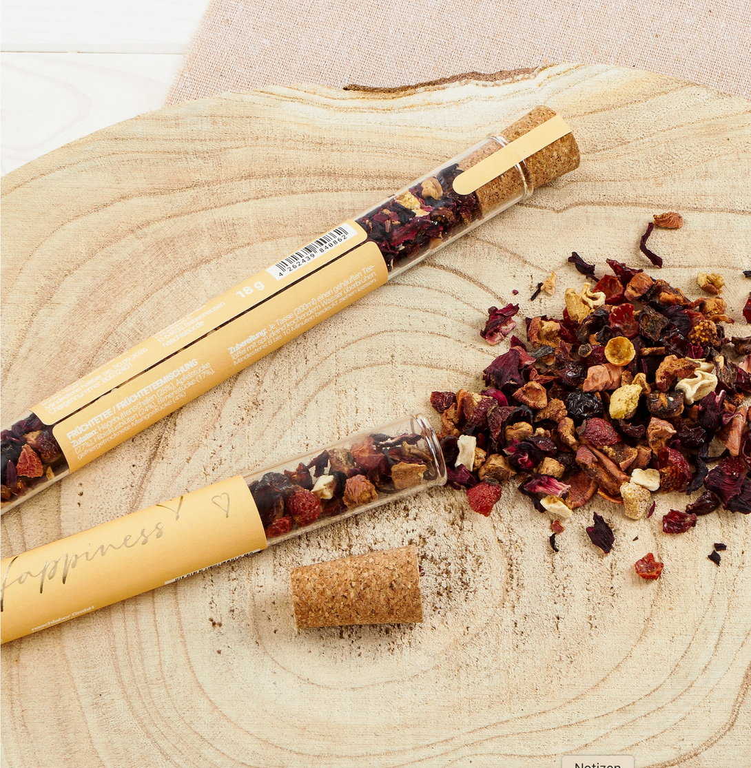 Der Happiness Früchtetee ist die perfekte Mischung für kleine Auszeiten. Mit Hagebuttenschalen, saftigen Apfelstücken, süßer Birne, Hibiskusblüten und gefrorener Mango schenkt er pures Fruchtaroma – ganz ohne Zuckerzusatz.
