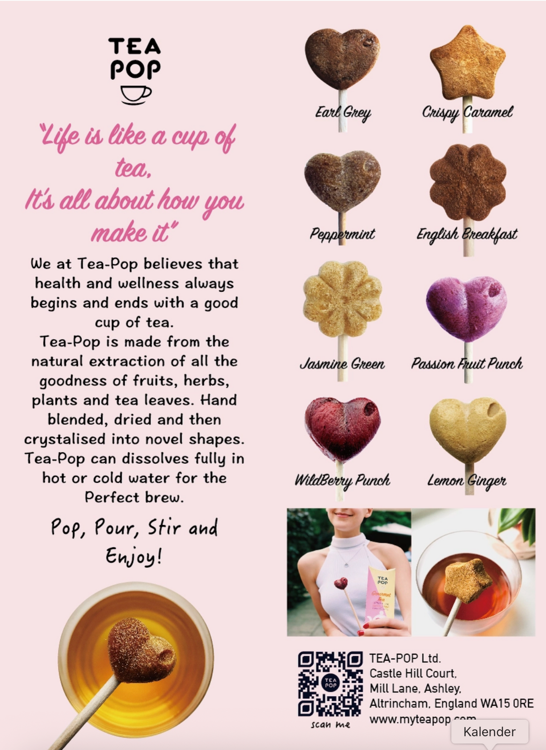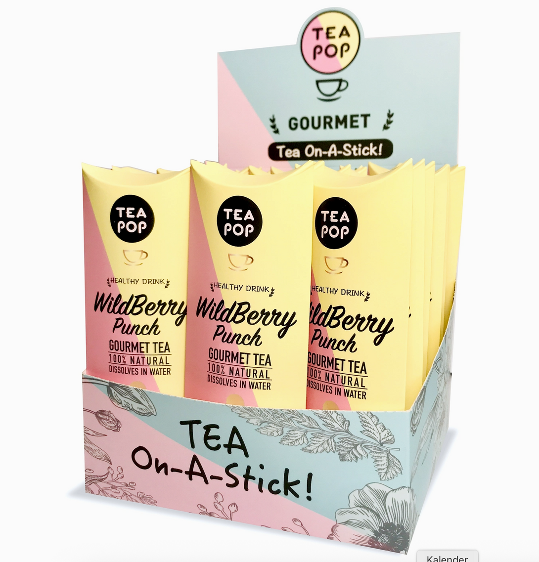 Mit Tea-Pop – Tee am Stiel erleben Sie Tee in einer völlig neuen Form. Hergestellt aus 100 % natürlichen Extrakten von Teeblättern, Früchten, Pflanzen und Kräutern, kristallisiert in Stick-Form und komplett löslich in heißem oder kaltem Wasser.