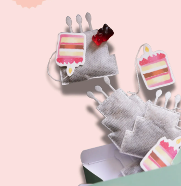 „10 handgenähte Teebeutel in Kuchenform – Geburtstagsgeschenk mit feinem Earl Grey, made in France.“