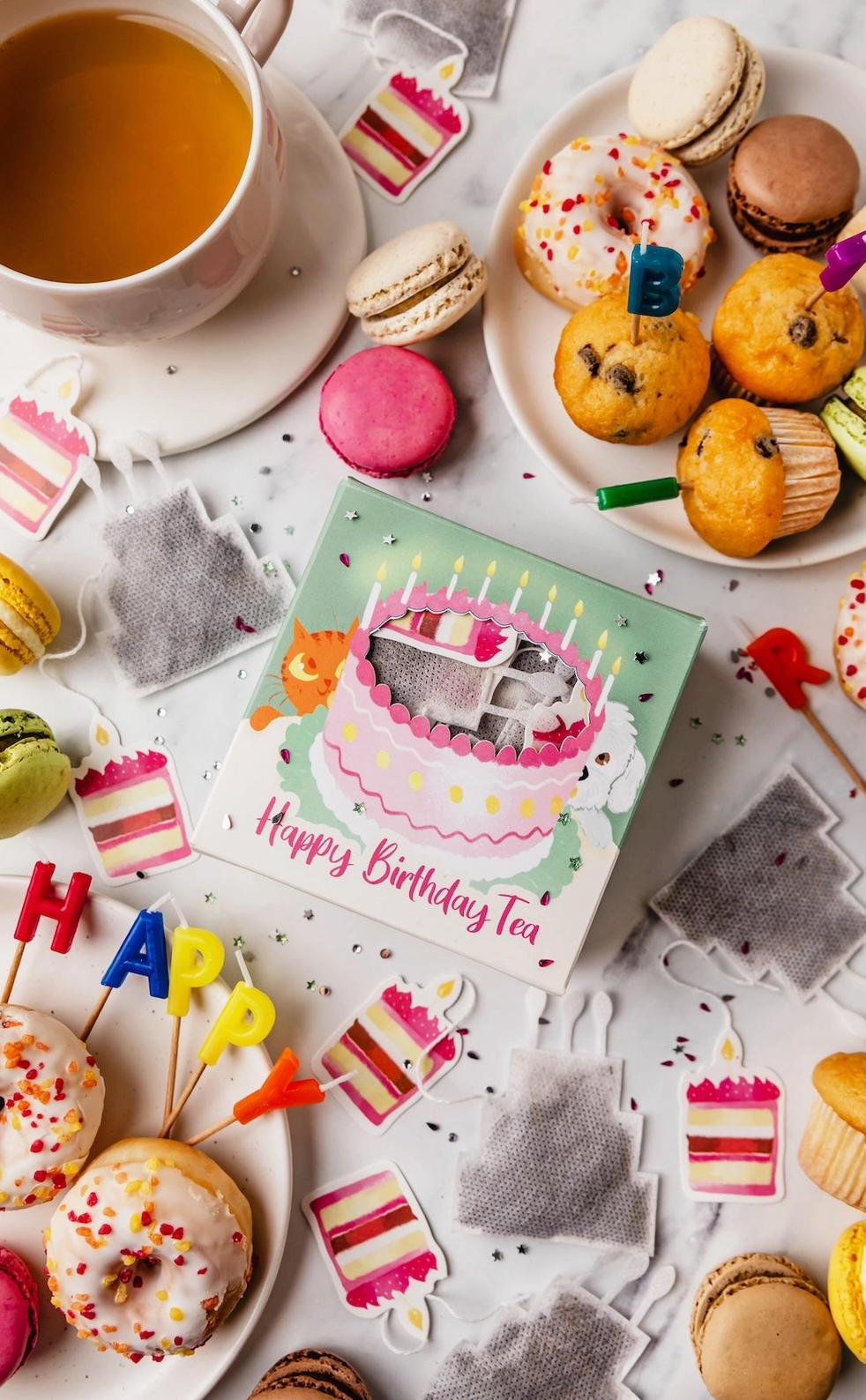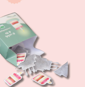 Dieses liebevoll zusammengestellte Teegeschenk-Set enthält 10 handgefertigte Teebeutel in Form kleiner Kuchenstücke – gefüllt mit feinem Earl Grey Schwarztee mit Bergamotte.