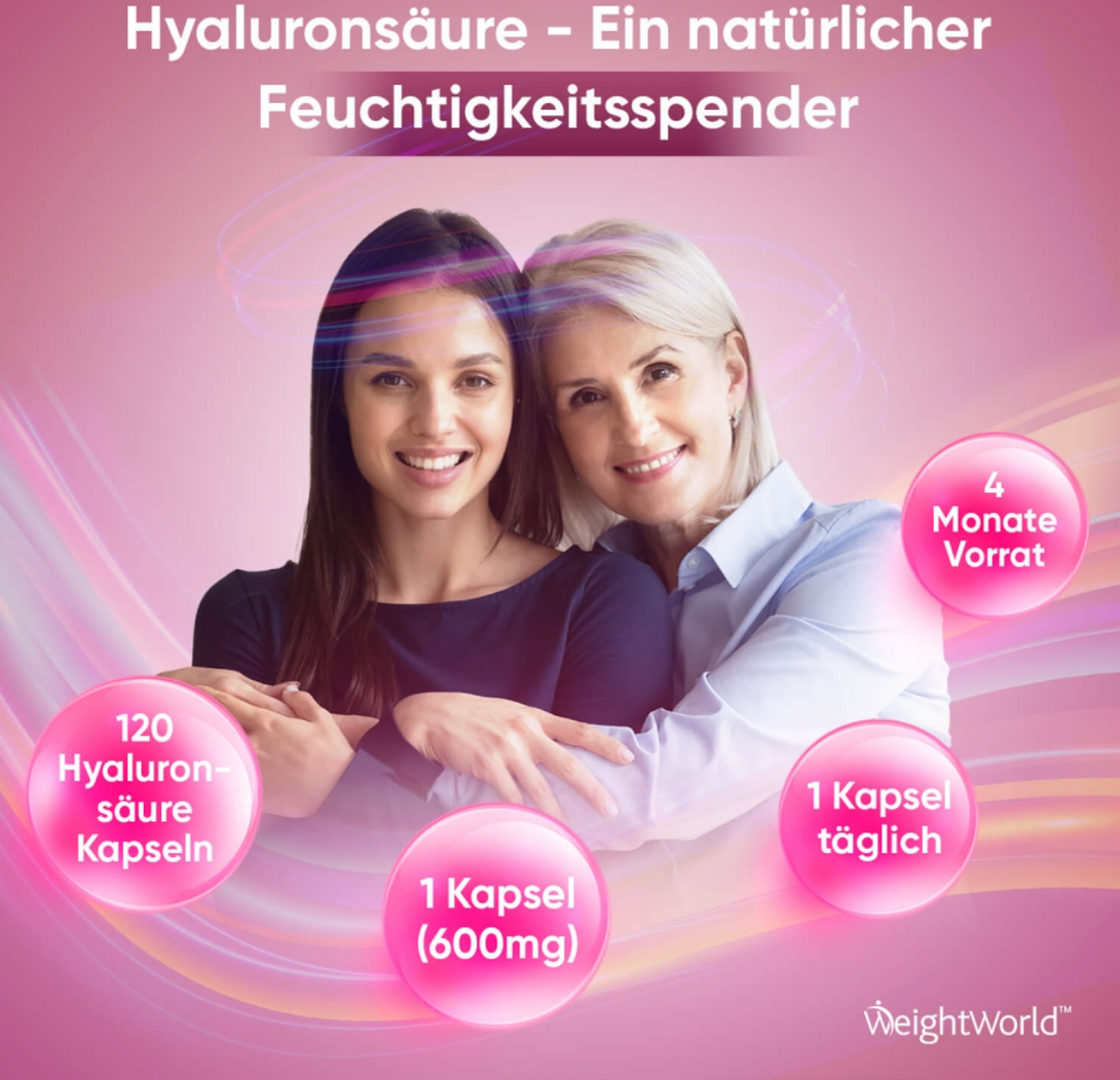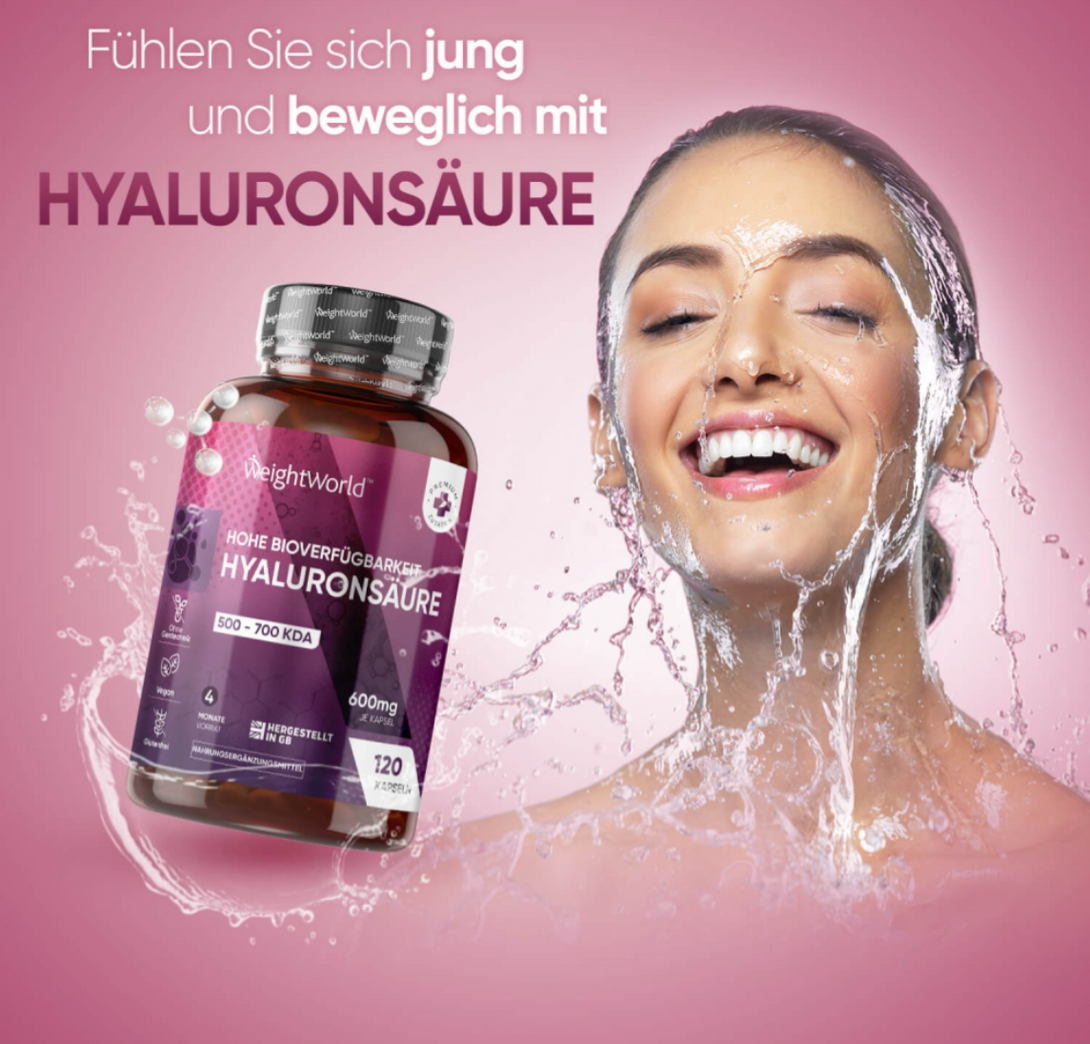 Mit zunehmendem Alter nimmt die körpereigene Produktion von Hyaluronsäure ab – die Folge: Falten, trockene Haut und steifere Gelenke. Unsere hochdosierten Hyaluronsäure Kapseln (600 mg pro Tagesdosis) helfen, diese natürlichen Defizite auszugleichen und unterstützen Haut, Knochen und Gelenke von innen heraus.