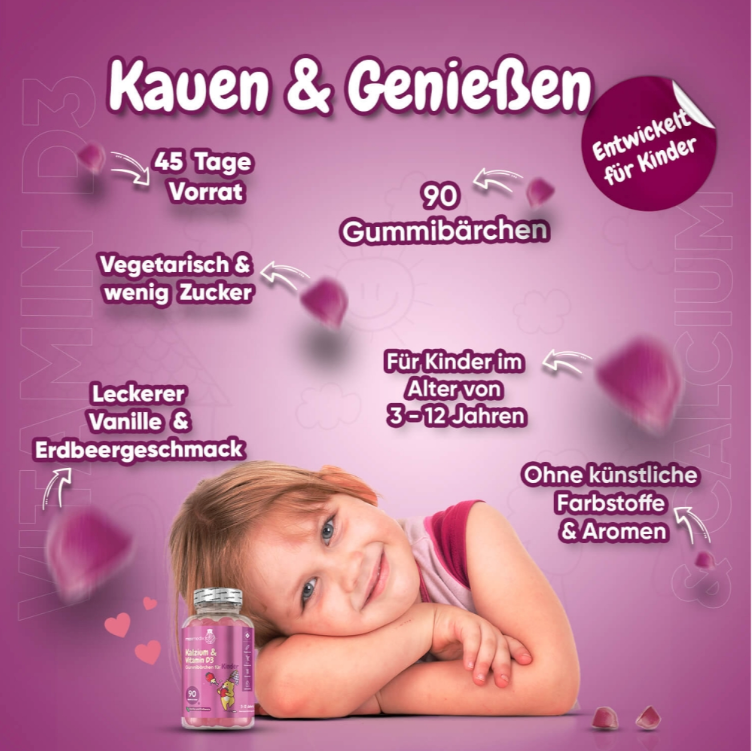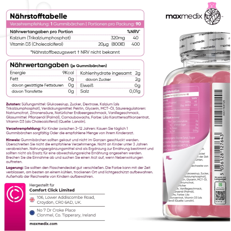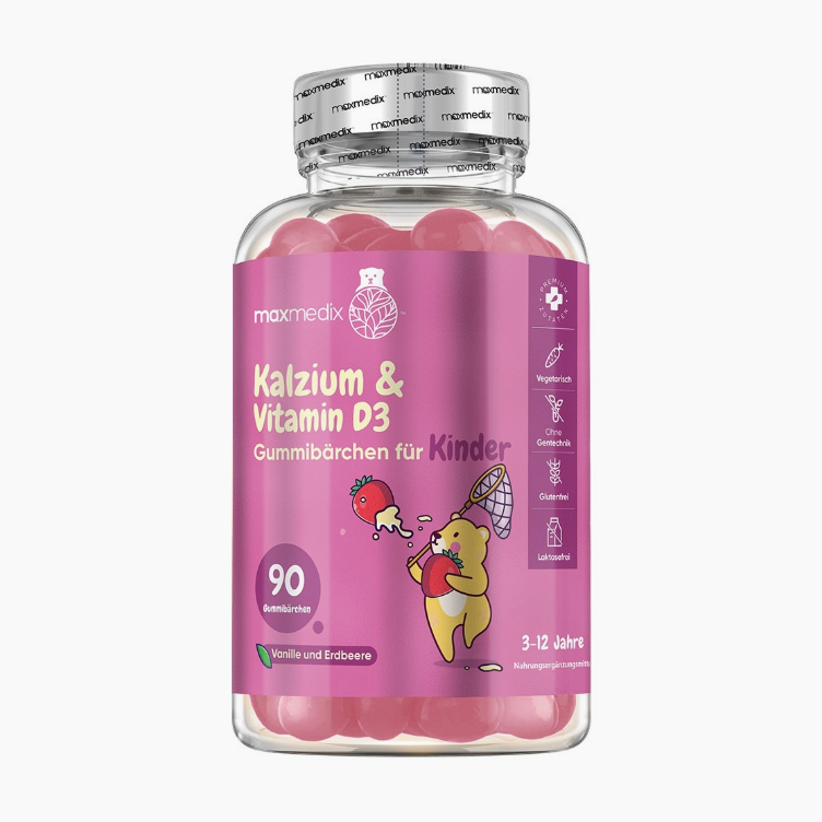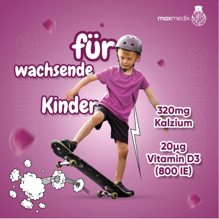 Die maxmedix Kalzium & Vitamin D3 Gummibärchen wurden speziell für Kinder im Alter von 3–12 Jahren entwickelt. Mit 320 mg Kalzium und 20 µg Vitamin D3 pro Tagesdosis unterstützen sie die normale Entwicklung von Knochen, Muskeln und Zähnen sowie die gesunde Funktion des Immunsystems.