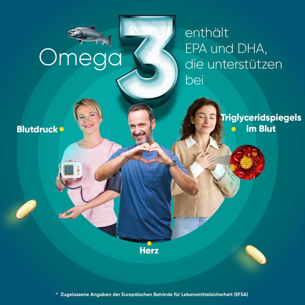 Omega-3 sind essentielle Fettsäuren, die der Körper nicht selbst herstellen kann. EPA und DHA – hauptsächlich aus Fischöl – unterstützen Herz, Gehirn, Augen und Gelenke, wirken entzündungshemmend und fördern die allgemeine Vitalität.