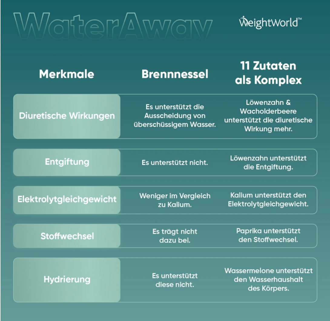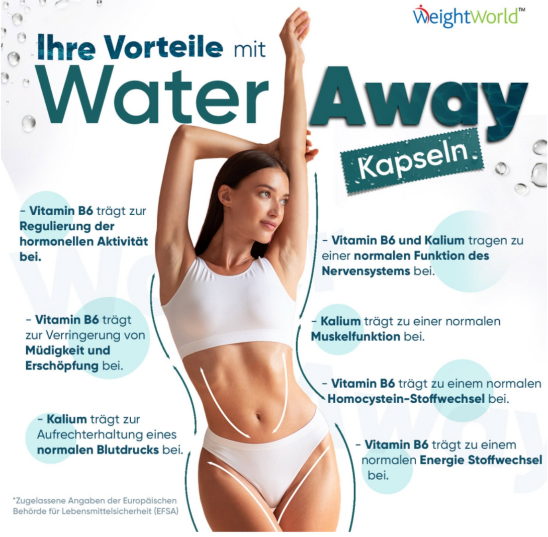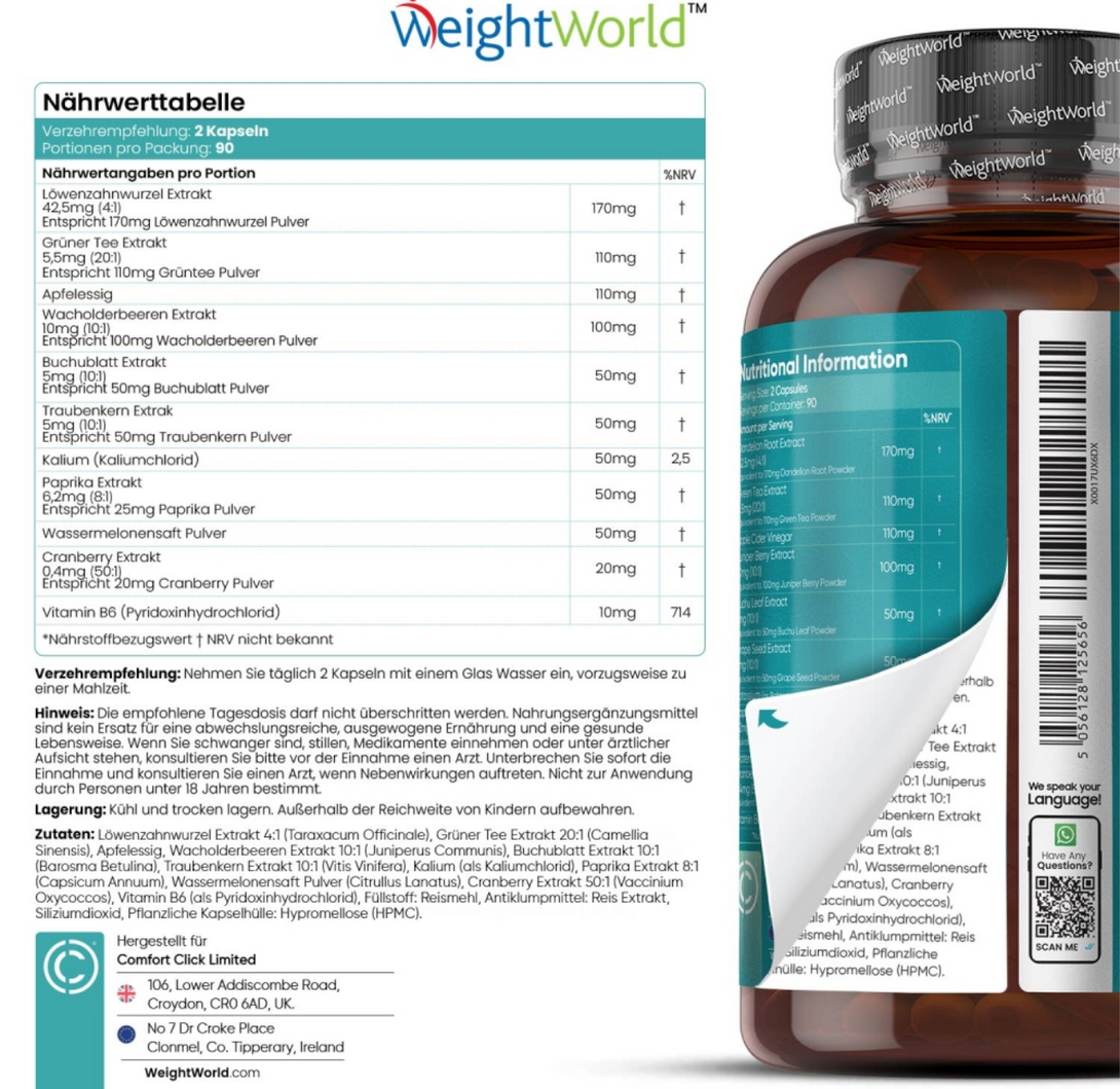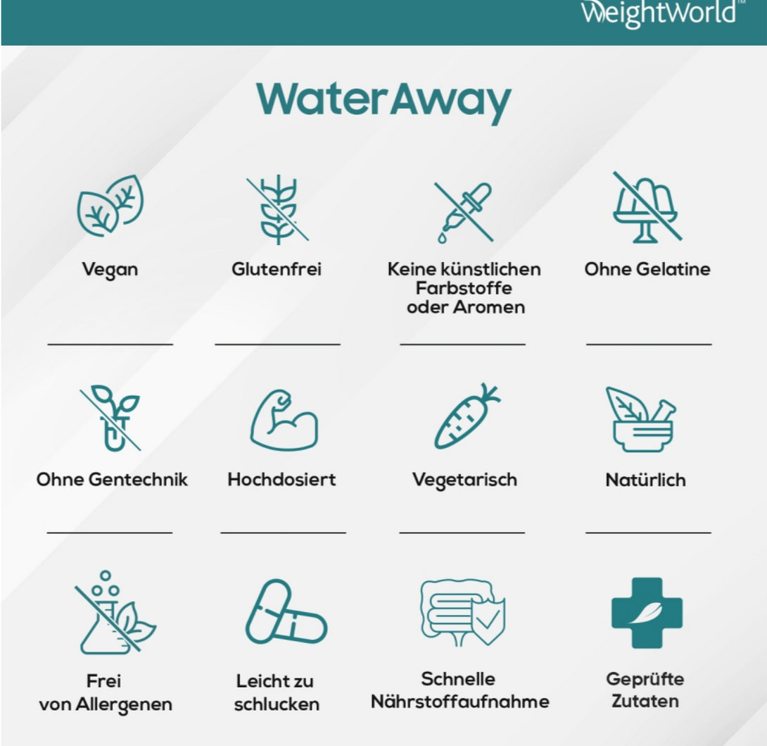 Die Water Away Kapseln von WeightWorld kombinieren traditionelle Pflanzenextrakte wie Löwenzahnwurzel, Wacholderbeeren, Buchublätter, Cranberry und Grünen Tee mit wichtigen Nährstoffen wie Kalium und Vitamin B6. Diese einzigartige Formel unterstützt den Körper dabei, überschüssige Flüssigkeit sanft auszuscheiden, Schwellungen zu reduzieren und gleichzeitig Energie, Stoffwechsel und Wohlbefinden zu fördern.