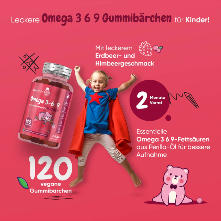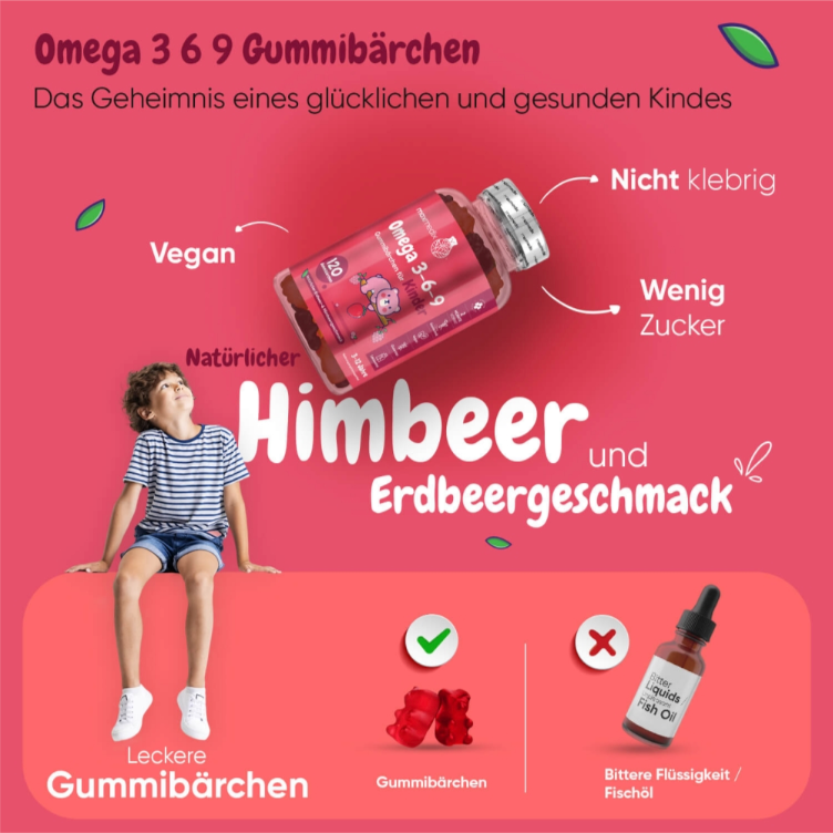 Omega 3-6-9 sind wichtige Fettsäuren für die Entwicklung von Herz, Gehirn und Augen. Mit den leckeren WeightWorld Gummibärchen erhalten Kinder eine optimale Kombination aus Omega-3 (Fischöl, Leinsamenöl), Omega-6 (Sonnenblumenöl) und Omega-9 (Olivenöl).