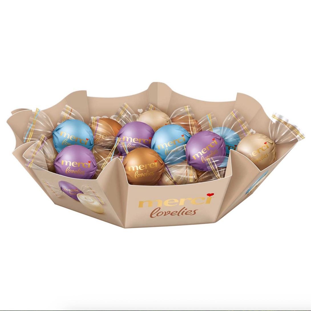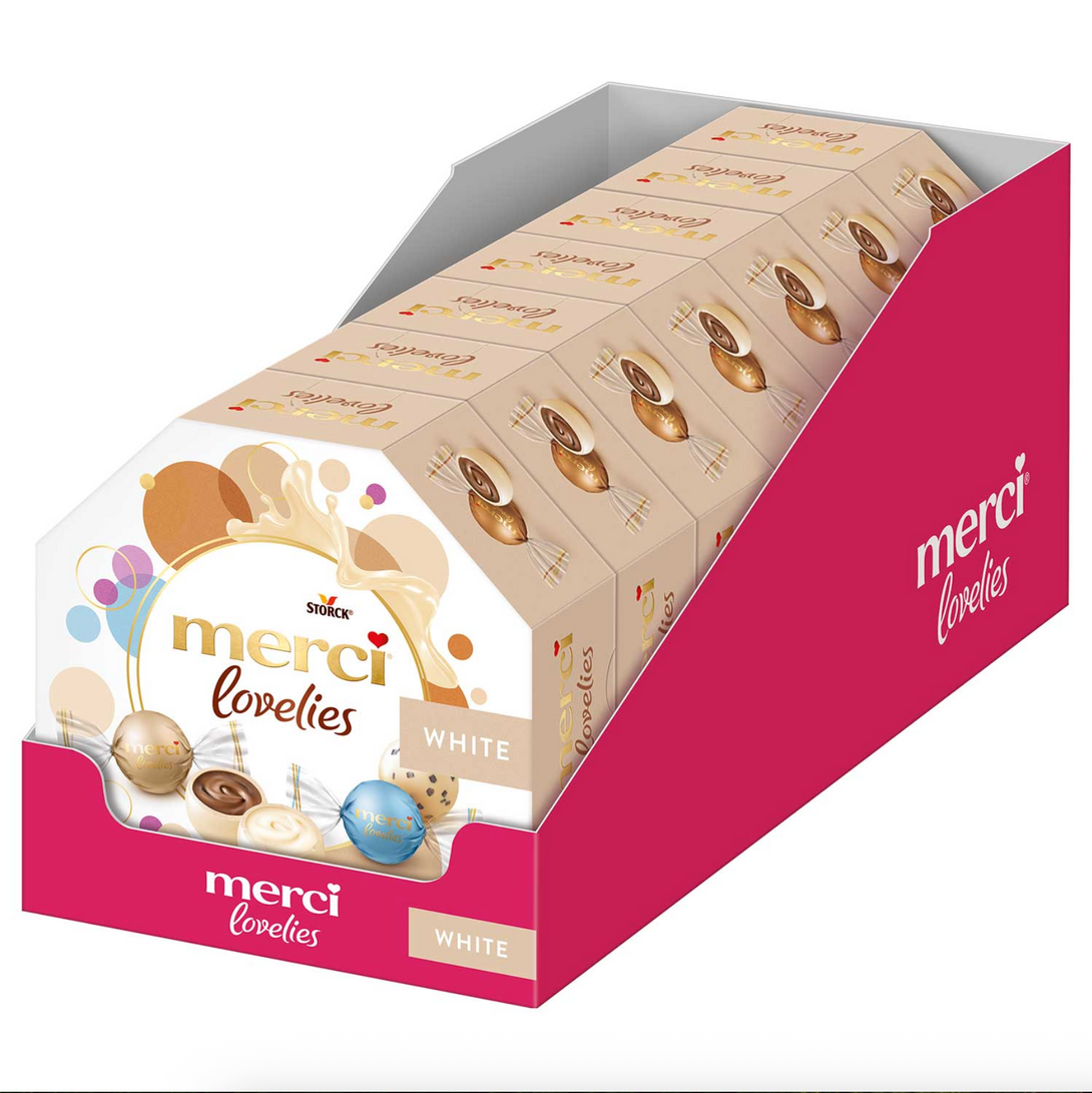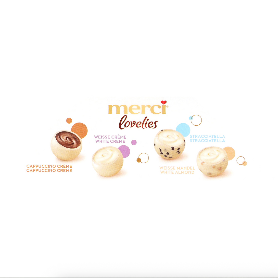 Die merci lovelies White sind das perfekte Geschenk für Genießer und Liebhaber weißer Schokolade. Jede Praline ist einzeln verpackt und besticht durch ihren milden, vollmundigen Geschmack. Die feine Hülle aus weißer Schokolade zergeht sanft auf der Zunge, während die cremigen Füllungen für ein unwiderstehliches Geschmackserlebnis sorgen.